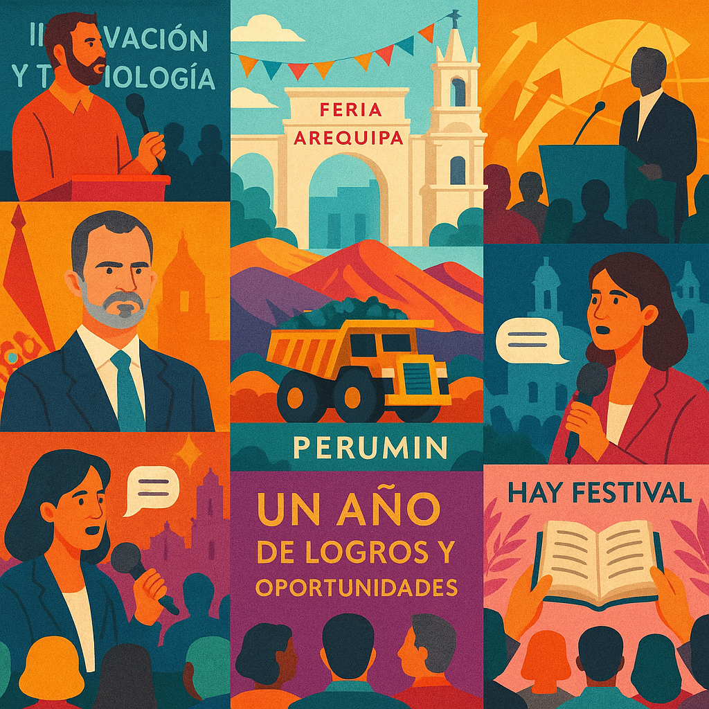 Posteriormente en octubre comenzamos con la importante visita de El Rey de España Felipe VI para participar durante la semana del “X Congreso Internacional de la Lengua Española Arequipa – Perú 2025”, evento que ayudó a posicionar a nuestra ciudad en el contexto cultural de la región. También en el mes de octubre se desarrolló el “Congreso Anual sobre la Región Arequipa – CARA 2025”, evento donde tocaron diversos temas políticos, económicos y sociales de nuestra ciudad y cerrando con un oportuno debate presidencial, con la visita de algunos candidatos donde presentaron sus diversas propuestas y sus posiciones políticas. En noviembre se desarrolló el “Hay Festival Arequipa 2025” evento que expone una gran diversidad de actividades culturales en nuestra ciudad, con la visita de expositores nacionales e internacionales impactando en el desarrollo cultural de Arequipa.
