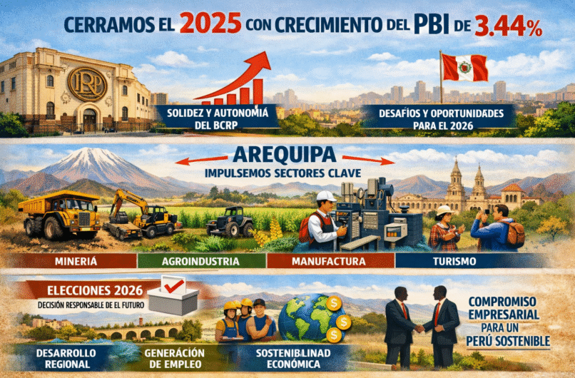 El principal desafío para este año será sostener y fortalecer el crecimiento del PBI, que ha mostrado una tendencia positiva en los últimos periodos. Lograrlo requiere un esfuerzo articulado entre todos los sectores económicos. Desde Arequipa, es clave seguir impulsando actividades estratégicas como la minería, la agroindustria, la manufactura, la construcción y el turismo, que constituyen pilares fundamentales para el desarrollo regional, la generación de empleo y la dinamización económica.